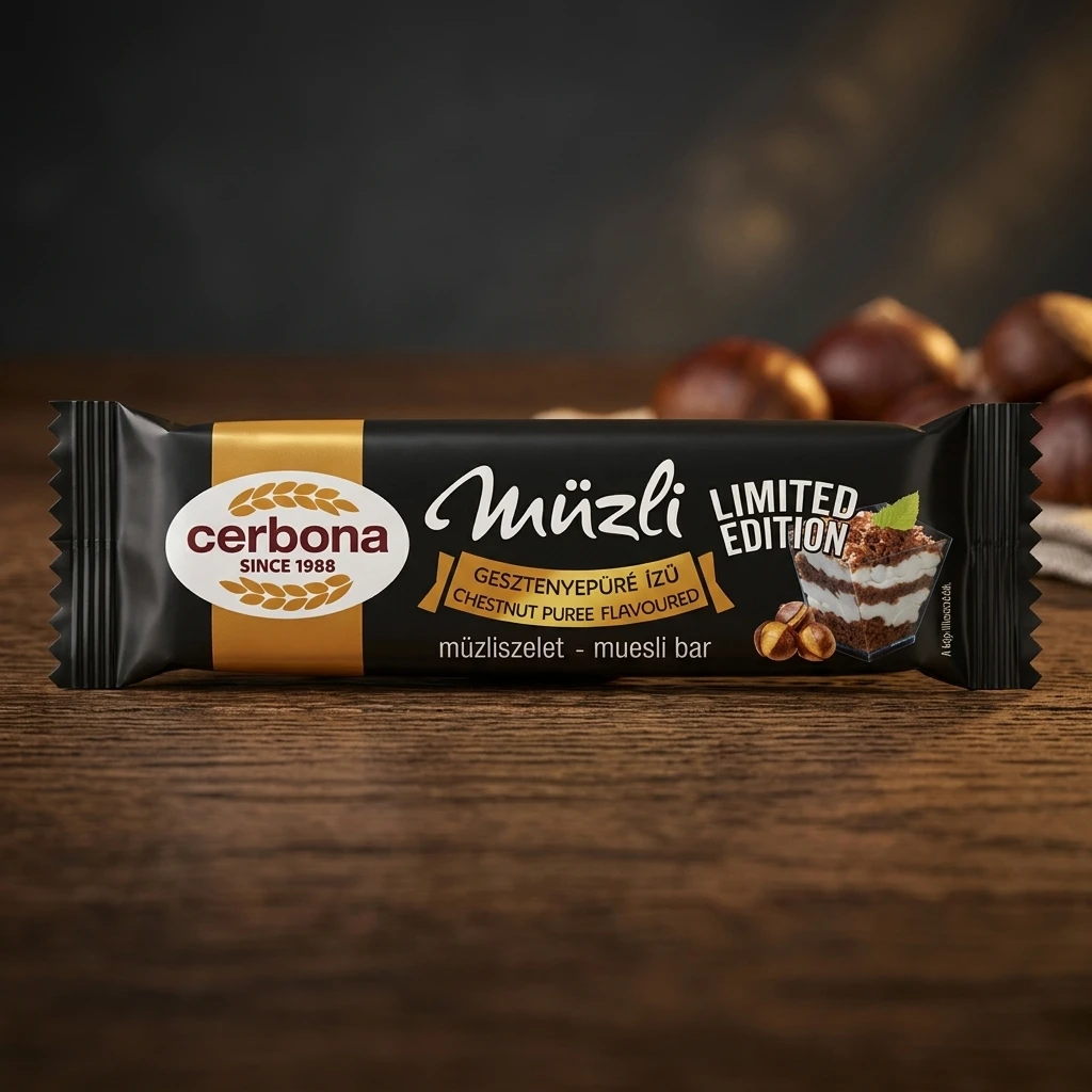 Fulgi de cereale extrudați 32% (griș de grâu 42%, făină de orez 38%, griș de grâu integral 12%, zahăr, mălai de porumb, sare de masă, emulgator: mono- și digliceride ale acizilor grași, pudră de cacao cu conținut redus de grăsime), masă de glazură albă 19% [zahăr, grăsime vegetală parțial hidrogenată (sâmburi de palmier), zer dulce pudră 14%, lapte praf degresat 4%, emulgator: lecitine; aromă], sirop de glucoză-fructoză, umectanți (sorbitol, glicerină), grăsime vegetală (palmier), făină de castane cu conținut redus de grăsime 5%, dextrină de grâu, oligofructoză (fibre vegetale), piure de castane 3,2% (castane 77%, zahăr, aromă), fulgi de ovăz laminați, maltodextrină, lapte praf degresat, arome, emulgator (lecitină din soia).