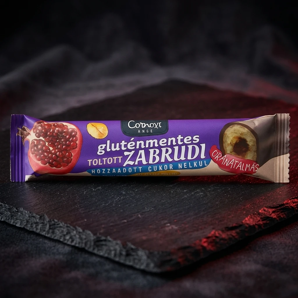 Fulgi de ovăz fără gluten 34%, îndulcitor: maltitol 22%, pastă de acoperire de cacao cu îndulcitor 17% (îndulcitor: maltitol; grăsime vegetală complet hidrogenată (miez de palmier), pudră de cacao fără grăsime 16%, emulgatori: lecitine, poliglicerol poliricinoleat; aromă), umplutură de rodie cu îndulcitor 14% (îndulcitor: maltitol; suc concentrat de rodie 35%; stabilizator: glicerol; agent de gelificare: pectine; acid alimentar: acid citric; aromă; concentrat de suc de sfeclă neagră; conservant: sorbat de potasiu), grăsime vegetală (palmier), fulgi de ovăz fără gluten, umectant: glicerol, emulgator: lecitine (soia), acid alimentar: acid citric, sare de bucătărie, aromă, conservant: sorbat de potasiu.