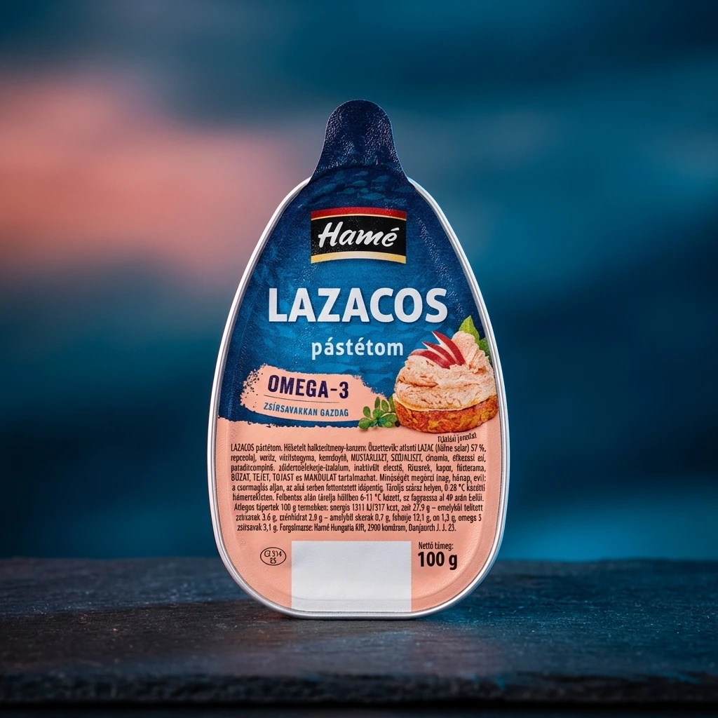 Somon de Atlantic (Salmo salar) 57%, Ulei de rapiță, Apă potabilă, Ceapă roșie, Amidon, Făină de muștar, Făină de soia, Suc de lămâie, Sare de masă, Piure de roșii, Izolat de proteine de mazăre verde, Drojdie inactivată, Condimente, Mărar, Aromă de afumătură.