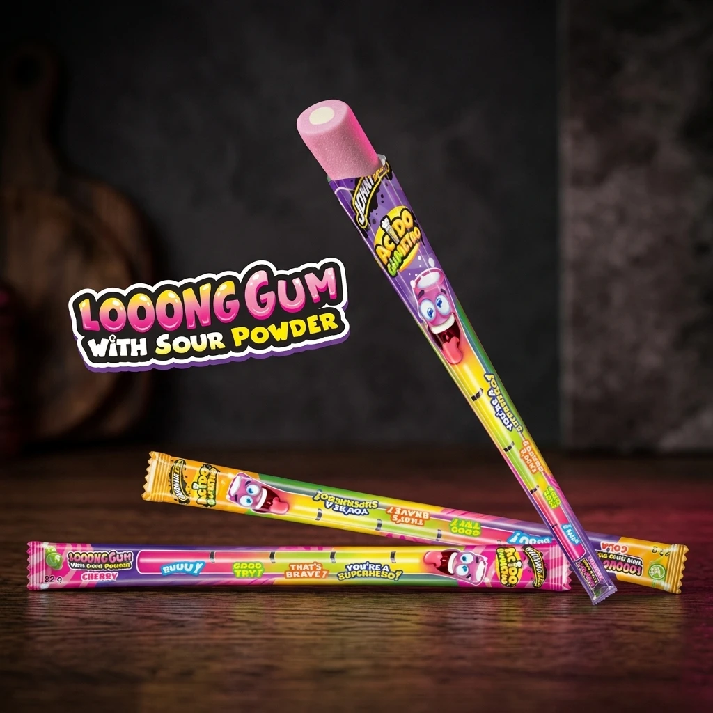 Sirop de glucoză, zahăr, dextroză, acid (E330), amidon de porumb, ulei vegetal de palmier, emulgator (E471, lecitină SOY), arome, proteine SOY, coloranți.