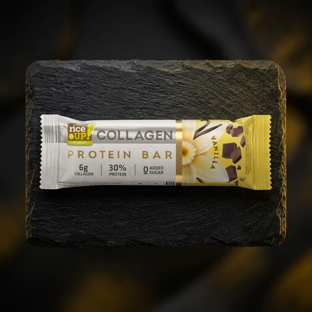 Proteine din lapte 30%, glazură de ciocolată 25% (masă de cacao, unt de cacao, lapte praf integral, umectant: maltitol, emulgator: lecitină de floarea soarelui), peptide de colagen hidrolizat 12% (carne de vită), chipsuri de soia (izolat de soia, pudră de cacao, sare), unt de cacao, unt de shea vegetal nehidrogenat, glicerină vegetală, fibre solubile (polidextroză ), arome naturale, prebiotic: glicozide de steviol (Stevia). Poate conține urme de nuci și arahide.