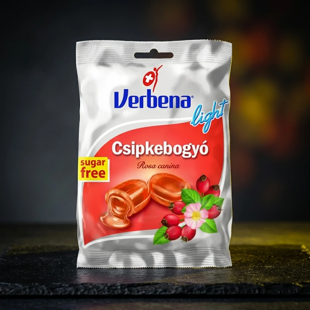 Îndulcitori 97% (izomalt, sirop de maltitol, glicozide steviolice), Acizi comestibili (acid citric, acid malic), Arome, Concentrat de pulbere de măceșe 0,2%, Extract de măceșe 0,2%, Vitamina C, Coloranți (carmin, curcumină), Extracte din plante (urzică, hibiscus), Maltodextrină, Aromă naturală.